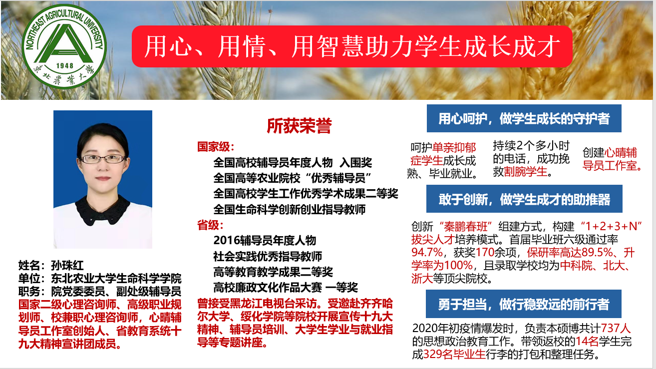 近日,由省委宣传部、省委教育工委主办的第十三届“黑龙江省高校辅导员年度人物”暨2021年“龙江最美高校辅导员”评选活动结果揭晓,公司副处级辅导员孙珠红获得2021年“龙江最美高校辅导员”荣誉称号。孙珠红将代表黑龙江省参加教育部2021年“最美高校辅导员”推选展示活动,这是公司辅导员首次被推荐参加全国最美高校辅导员评比。