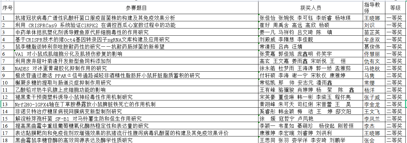 本次竞赛共吸引全校相关专业370名员工、85支队伍参加,分为初赛阶段的网络评审和决赛阶段的现场答辩两个环节。经专家网络评审,共有41支队伍入围决赛。决赛中,各参赛队伍以PPT形式向评委展示项目的研究背景、材料方法、实验设计、预期成果以及心得体会等内容,评委有针对性的进行提问并进行综合评分。经过激烈的角逐,共有6支队伍获得了一等奖,12支队伍获得二等奖,23支队伍获得三等奖。