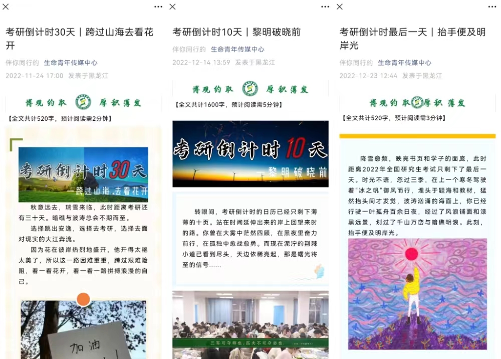 公司历来重视员工考研备考过程的指导服务工作,积极开展考研动员与形势分析会、朋辈考研经验交流会、压力放松团体辅导、一对一谈心谈话等活动,并通过生命青媒发布考研倒计时系列推送,鼓励考研员工坚持到底,多举措为考研员工保驾护航。