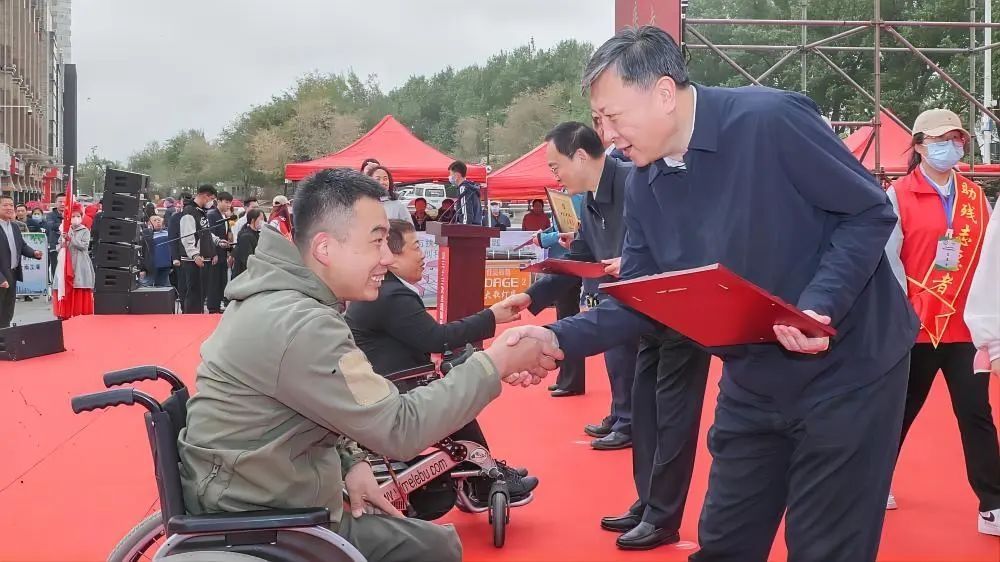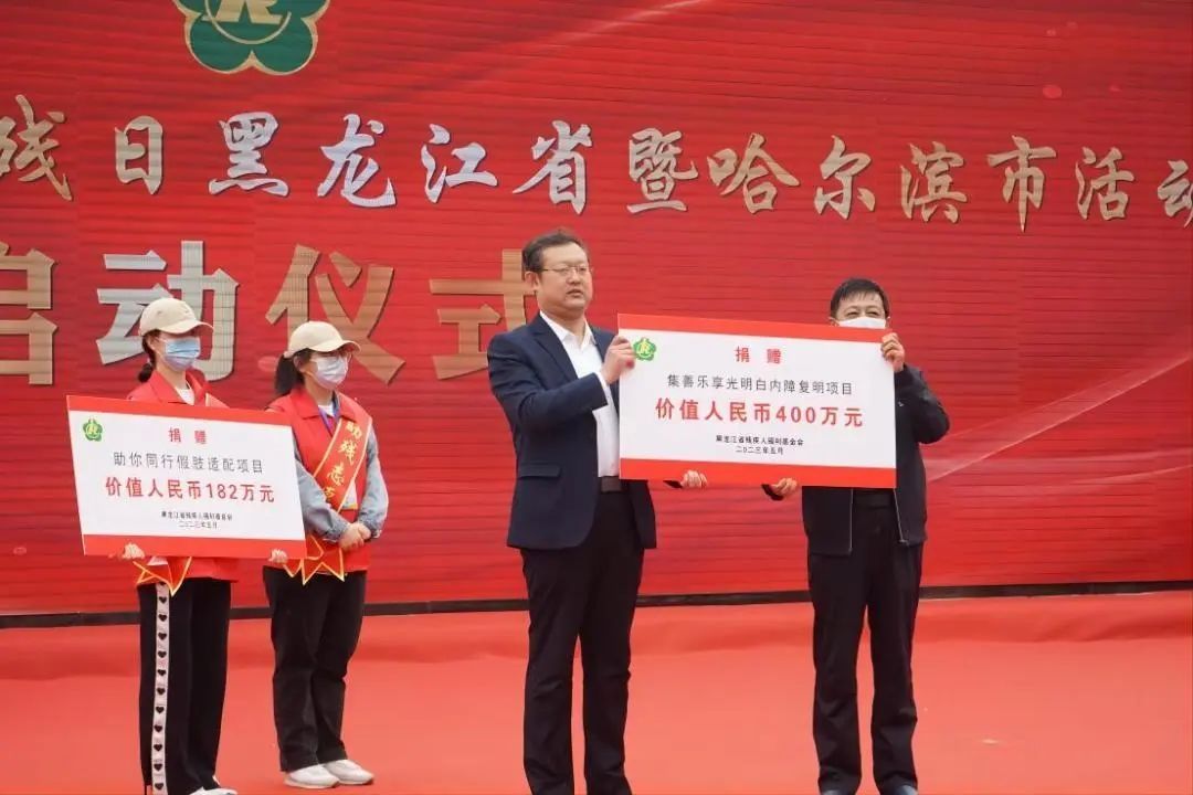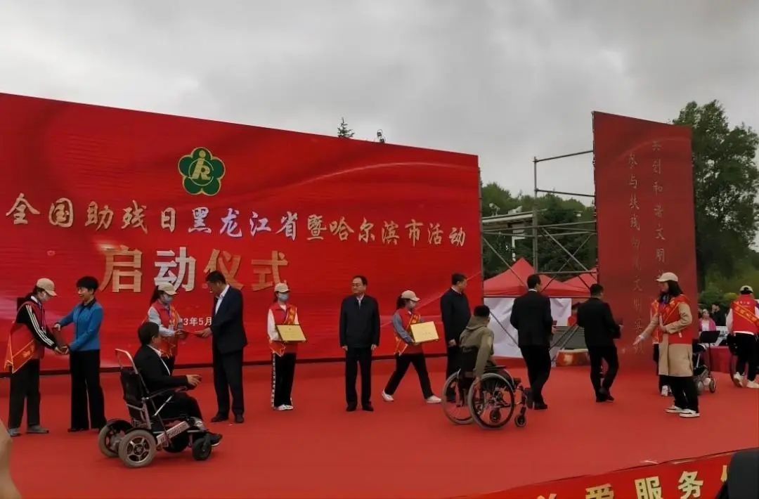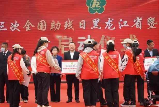 启动仪式上,志愿者上台协助颁发“黑龙江省残疾人创业典型”奖牌。