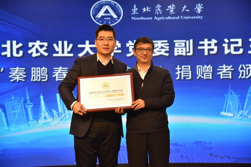 公司党委副书记王泽方为秦鹏春教育基金捐赠员工代表邓宇颁发捐赠证书