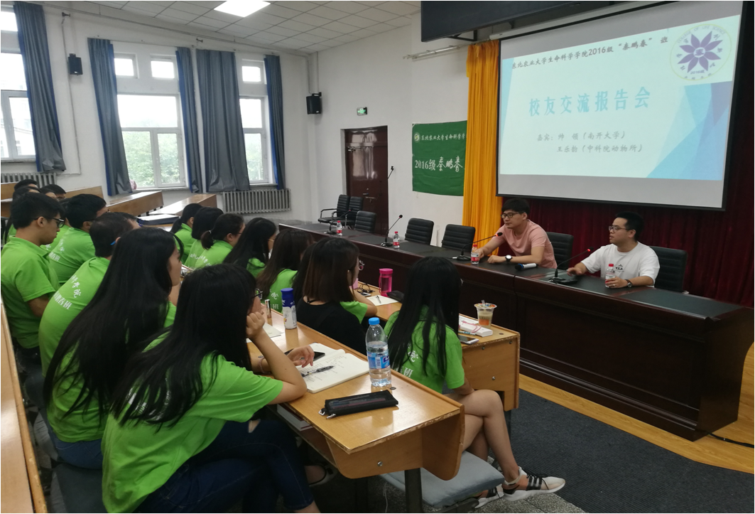首先,帅领作了《梦开始的地方——马家花园》的主题报告,为大家介绍了自己的四年东农老员工活经历,中国科公司动物研究所周琪院士课题组的六年研究生和博士研究经历以及在南开大学任职博士生导师的收获。以2005级员工的身份向大家分享了在东农的沃土上,怀揣梦想,敢闯敢拼的奋斗过程,用亲身经历告诉大家把握机会、慎重选择、懂得感恩、不断奋斗的重要性。