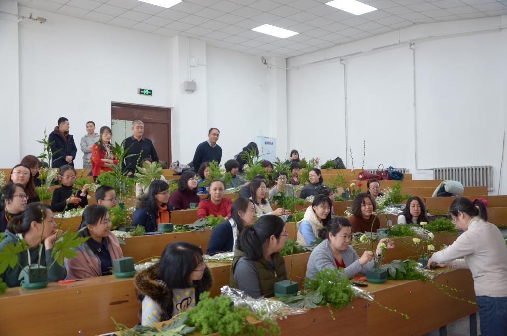 培训会正式开始,首先刘教授给大家讲授了插花艺术的含义,带领大家欣赏了不同风格的插花艺术。接下来是插花实践活动,老师们纷纷上前台取用自己喜欢的花卉,在刘教授的指导下自由发挥,进行创作,还不时观摩其他老师的作品,十分惬意。最后,每位参加活动的老师都收获了一份满意的插花作品,并合影留念。