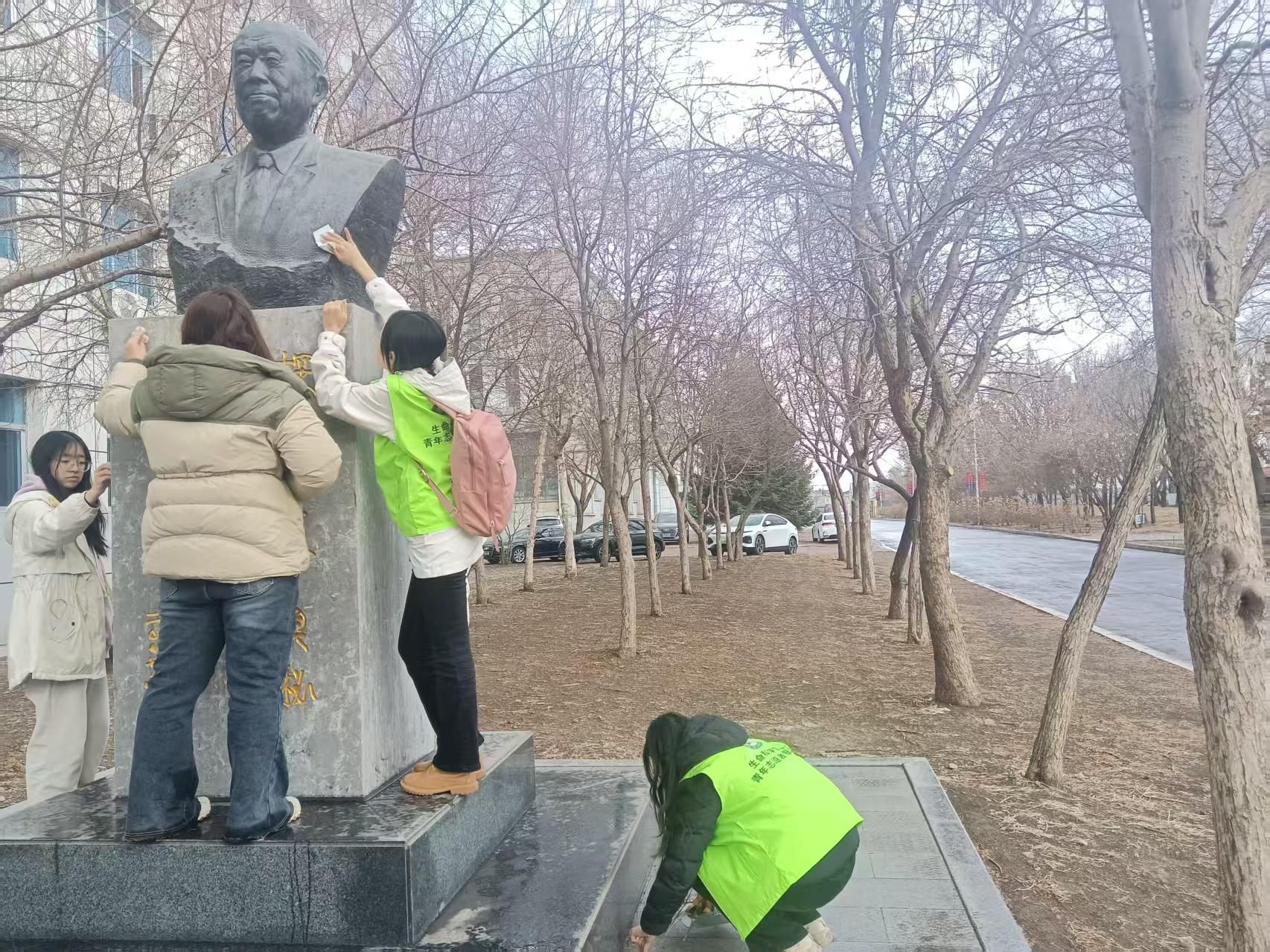 3月12日,公司志愿者在秦鹏春雕像前开展维护与清扫工作。他们手持清洁工具,细致地擦拭雕像的每一部分,确保不遗留任何灰尘和污渍。