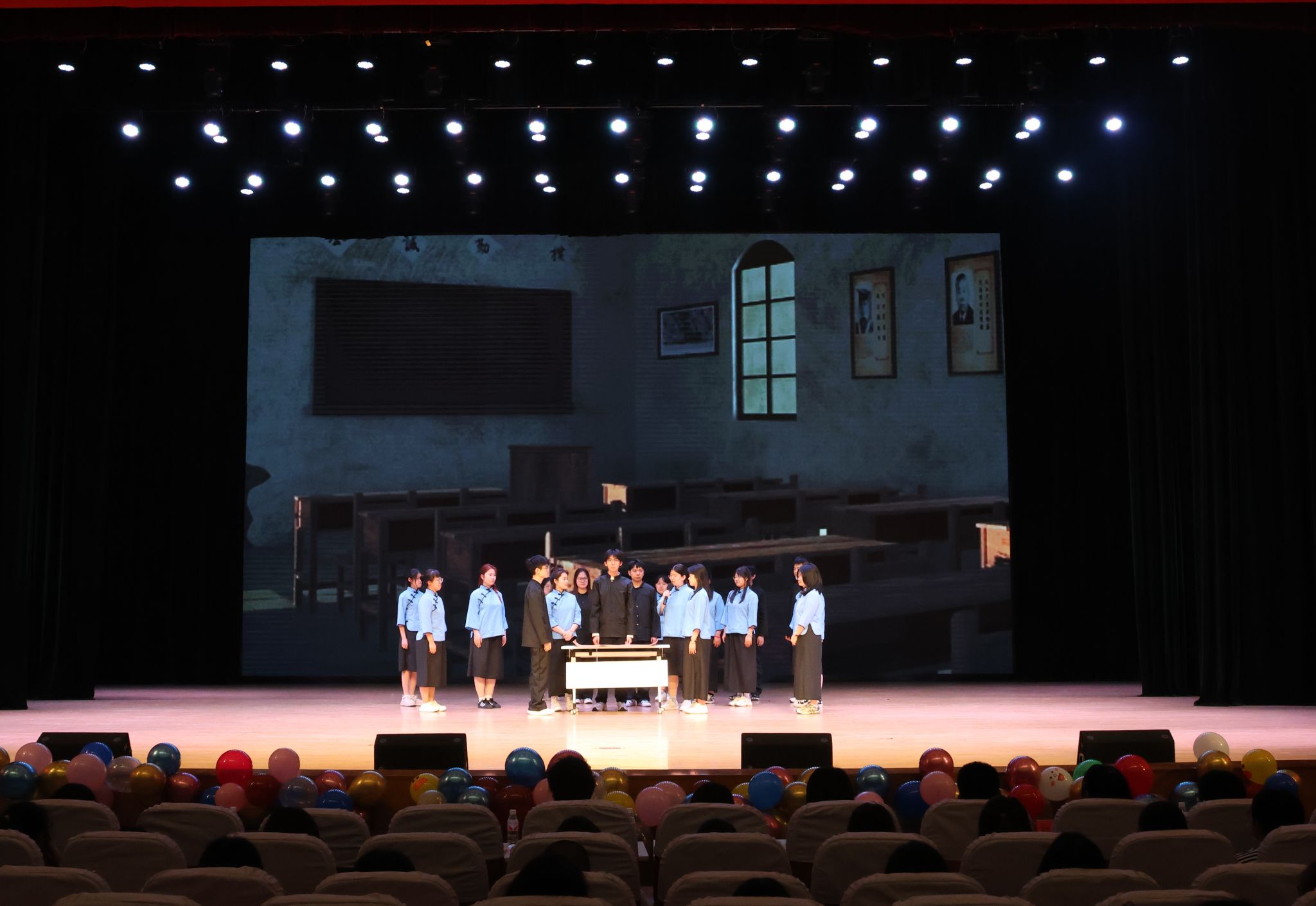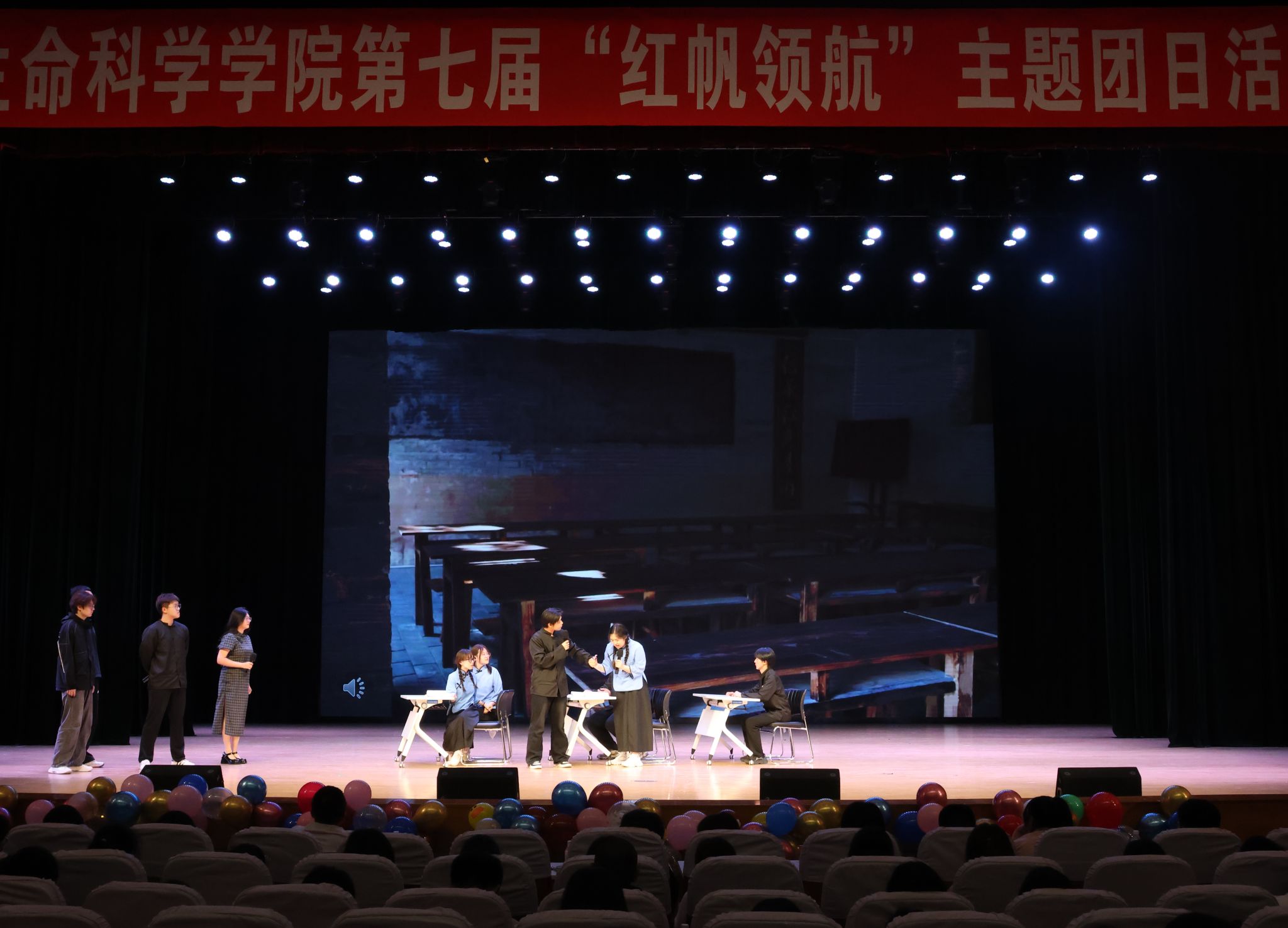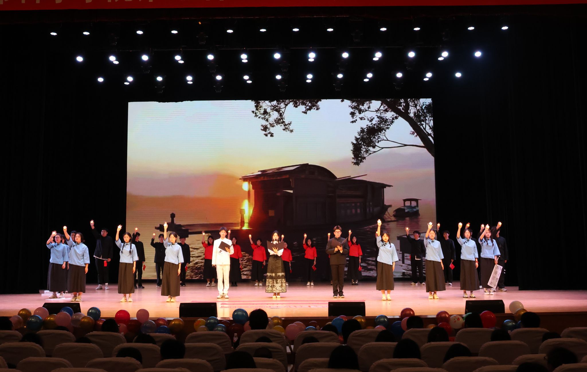 2023级11个本科团支部以班级为单位,通过朗诵、舞台剧、情景剧等不同形式进行艺术展演,情景剧《破晓》《烽火弦歌:西南联大的星辰》《燎原之火》《如愿》《红岩黎明之际》用舞台演绎重塑觉醒年代的信仰之光,展现百年前青年如星火汇聚,照亮中国前行道路,激荡新时代青年心灵。