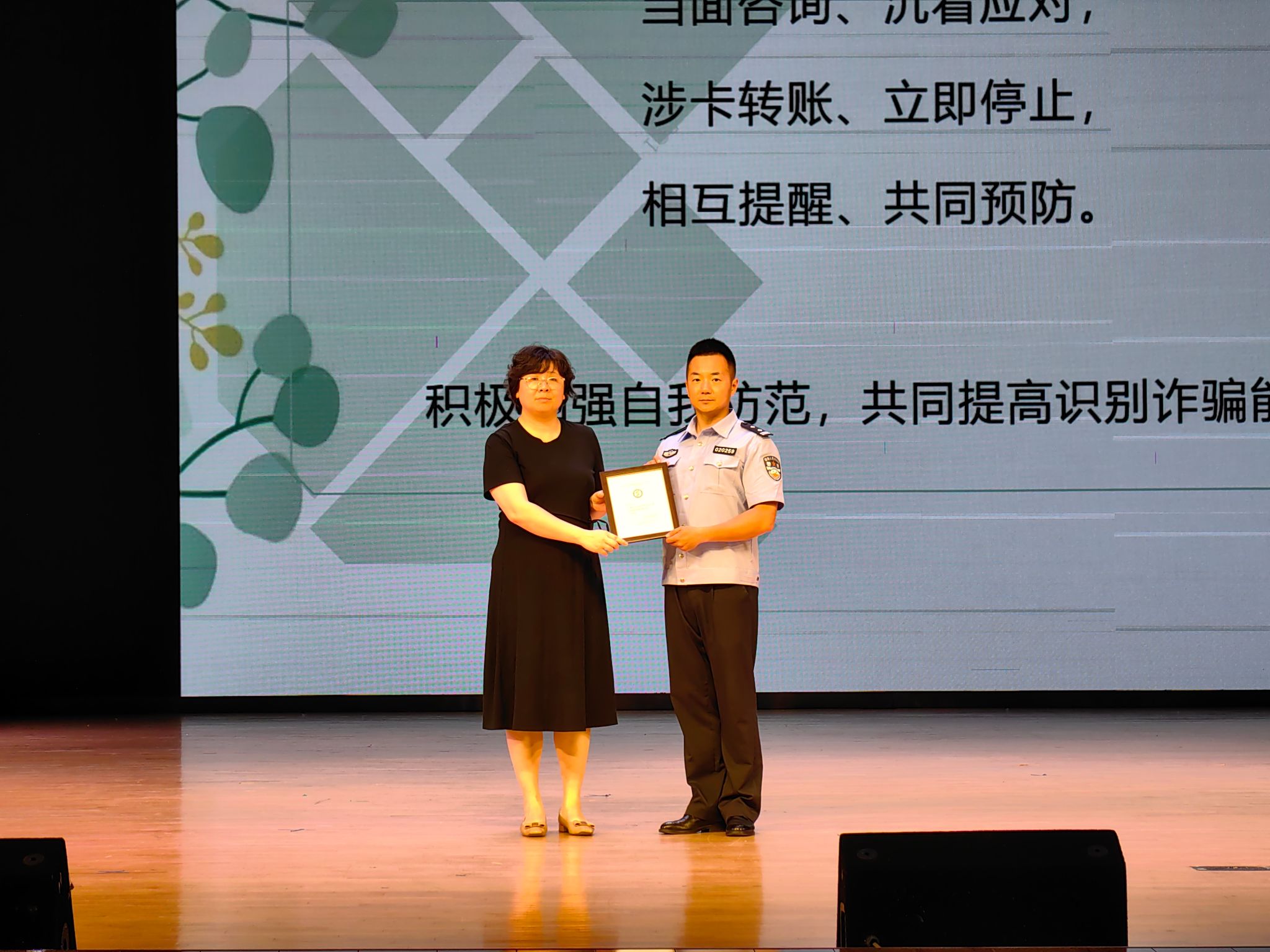 曹志明警官结合丰富的从业经验,从十余种类型的诈骗手段引入,围绕非法集资、校园贷、套路贷、刷单返利诈骗、虚假投资理财诈骗等典型非法金融活动开展了宣传教育,案例典型,警示到位,让员工深刻认识到了非法金融活动的危害性,切实提升了员工金融素养与风险识别能力。李水童为曹警官颁发了纪念证书。