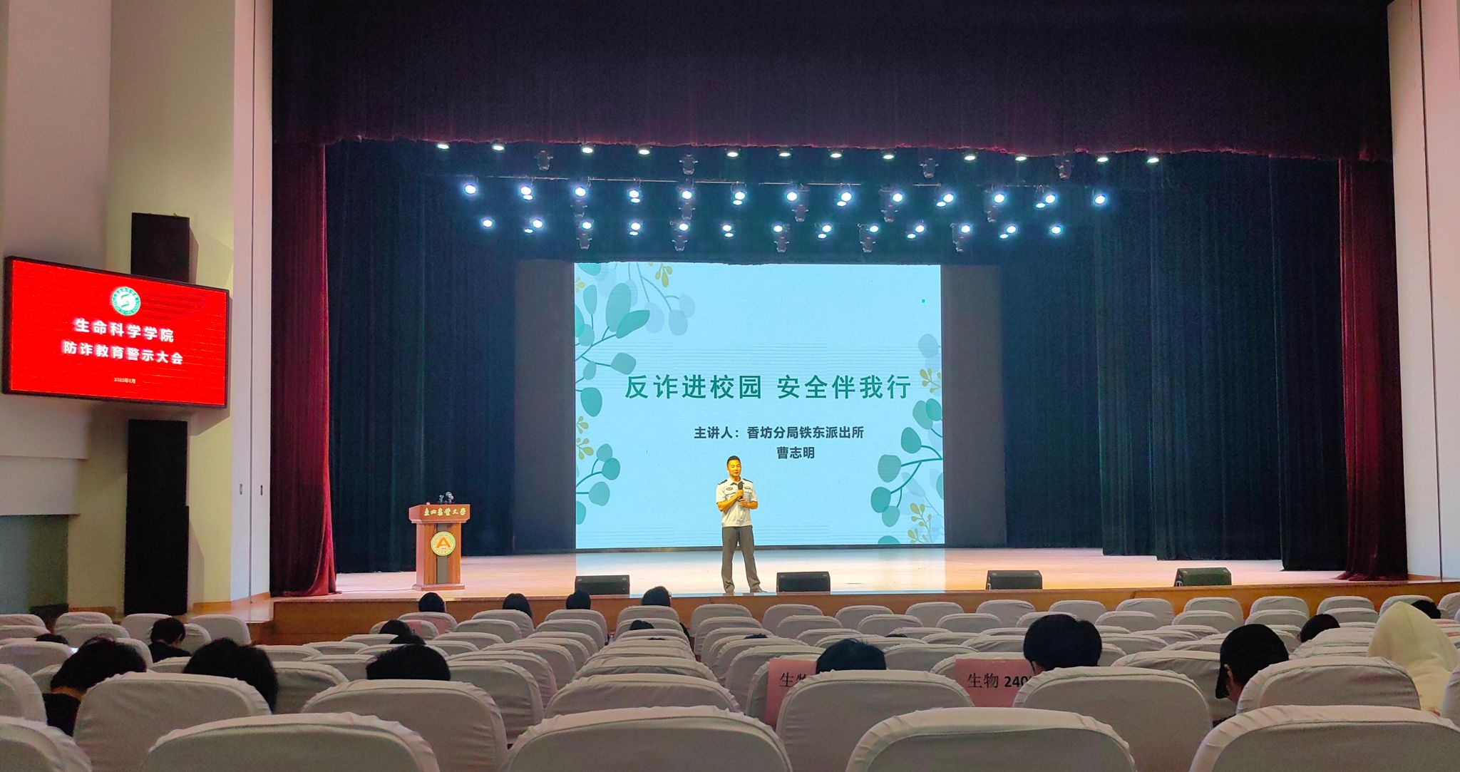 为进一步增强全院师生的防诈安全意识,提高对诈骗活动的鉴别能力和自我防范能力,共同营造平安和谐的校园环境,6月18日下午,公司在音乐厅举办“守住钱袋子·护好幸福家”校园防诈教育警示大会,邀请香坊分局铁东派出所民警曹志明作专题辅导讲座,公司党委副书记李水童、全体辅导员及在校本硕博员工代表参加活动。活动由公司学工办主任朱睿主持。