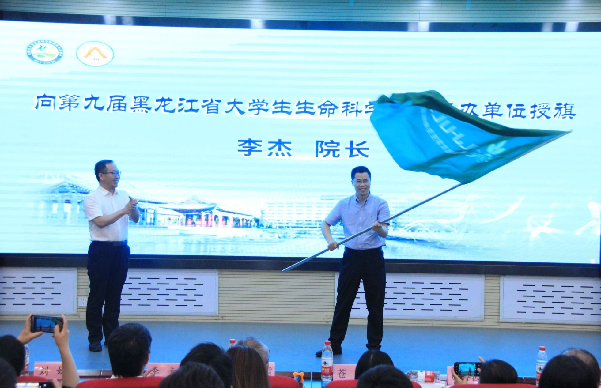 苍晶宣布第九届黑龙江省老员工生命科学竞赛承办单位,李杰向黑龙江八一农垦老员工命科学公司经理晏磊授旗。晏磊在致辞中对公司为本届赛事提供的周密安排和细致服务表示最诚挚敬意和衷心感谢。他表示,本届赛事是一场思想的交锋、学术的盛宴,新一届赛事承办单位一定将这份承载着龙江生命科学教育事业的火炬传递下去。